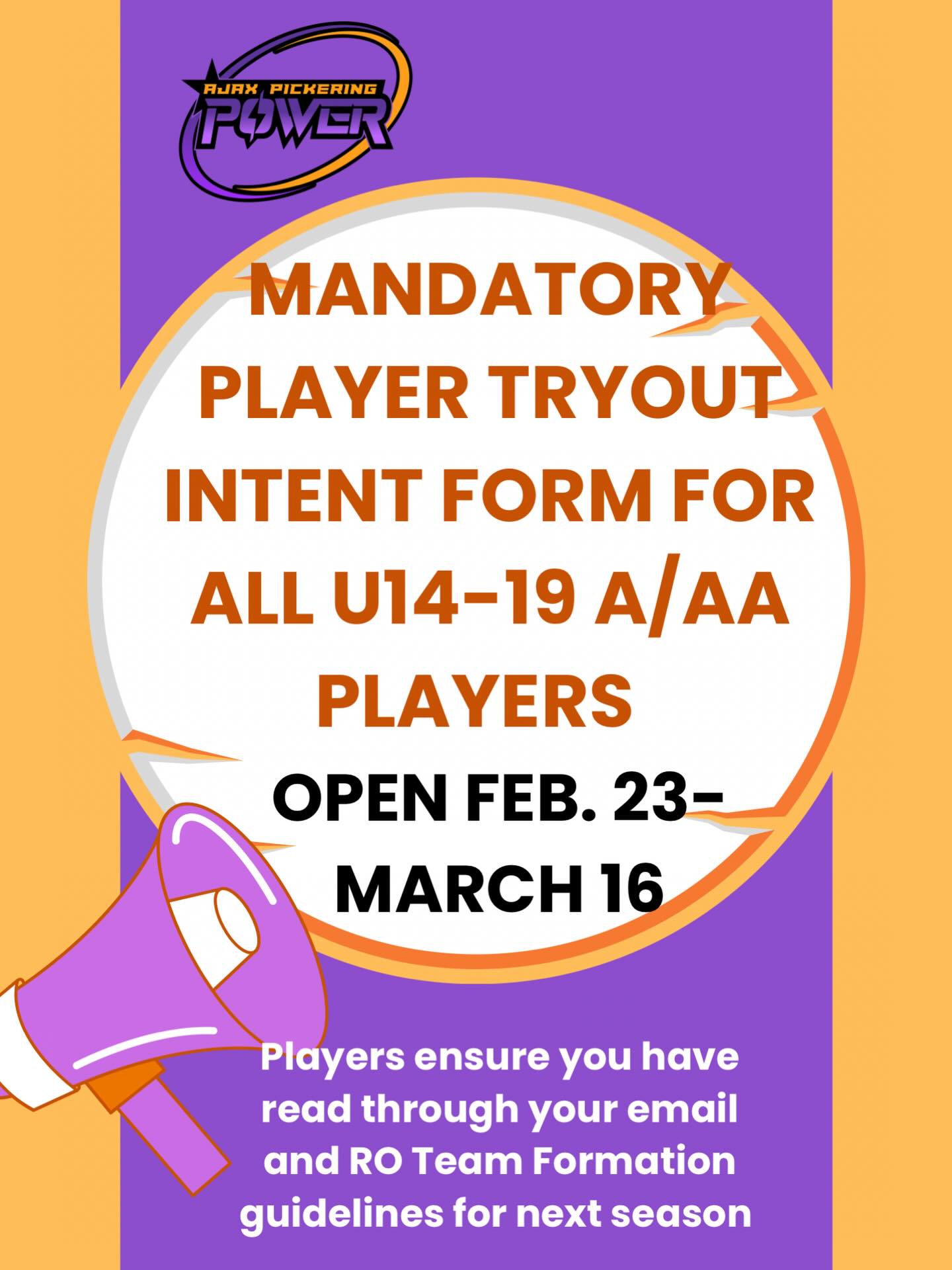 All U14-19 players wishing to try out at the A or AA level must submit an Intent to Tryout Form by the Ringette Ontario deadline of March 16th. Athletes will not be permitted to participate in tryouts without a completed Intent to Tryout Form.